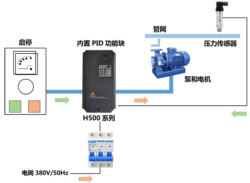 變頻恒壓供水系統(tǒng)采用一電位器設(shè)定壓力(也可采用面板內(nèi)部設(shè)定壓力),采用一個壓力傳感器(反饋為4~20mA或0-10V)檢測管網(wǎng)中壓力,壓力傳感器將信號送入變頻器PID回路,PID回路處理之后,送出一個水量增加或減少信號,控制馬達轉(zhuǎn)速。如在一定延時時間內(nèi),壓力還是不足或過大,則通過PLC作工頻/變頻切換,使實際管網(wǎng)壓力與設(shè)定壓力相一致。