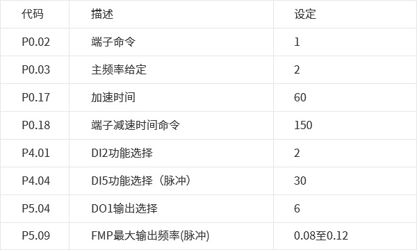 1、接線 ①輸入(主電源)R S T ,輸出(電機)U V W ②啟動信號 DI1正轉 DI2反轉 COM公共端 ③故障接點 TC1 TB1 ④頻率給定 AI1 10V GND ⑤FM COM 脈沖接收 ⑥DO1 GND 電機報警 ⑦GND與COM短接,DI5與FM短接 | 2、變頻器內置參數(shù)