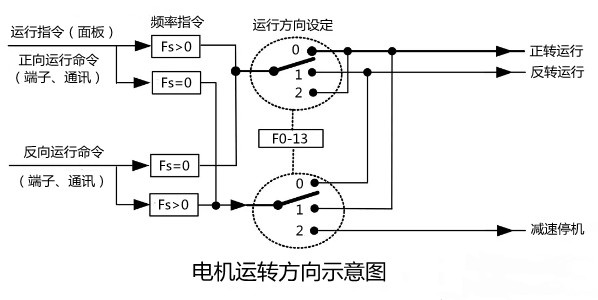 在有的驅(qū)動系統(tǒng)中,只允許系統(tǒng)正轉運行而不允許反轉運行,則需要將F0-13=2,此時若出現(xiàn)反轉指令,則變頻器將減速至0并進入停機狀態(tài),同時操作面上FWD/REV一直閃爍。
