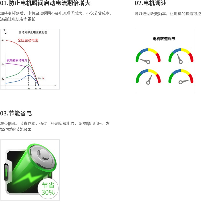 產(chǎn)品特點 | · 安裝方便:支持螺釘安裝和導(dǎo)軌安裝 · 功率密度高:有效實現(xiàn)產(chǎn)品體積最小化 · 快速限流:硬件快速限流功能,避免變頻器頻繁的出現(xiàn)過流故障 · 簡易PLC、多段速度運行:通過內(nèi)置PLC或控制端子實現(xiàn)最多16段速運行 · 內(nèi)置PID:可方便實現(xiàn)過程控制閉環(huán)控制系統(tǒng) · 過壓過流失速控制:對運行期間電流電壓自動限制,防止頻繁過流過壓跳閘 |